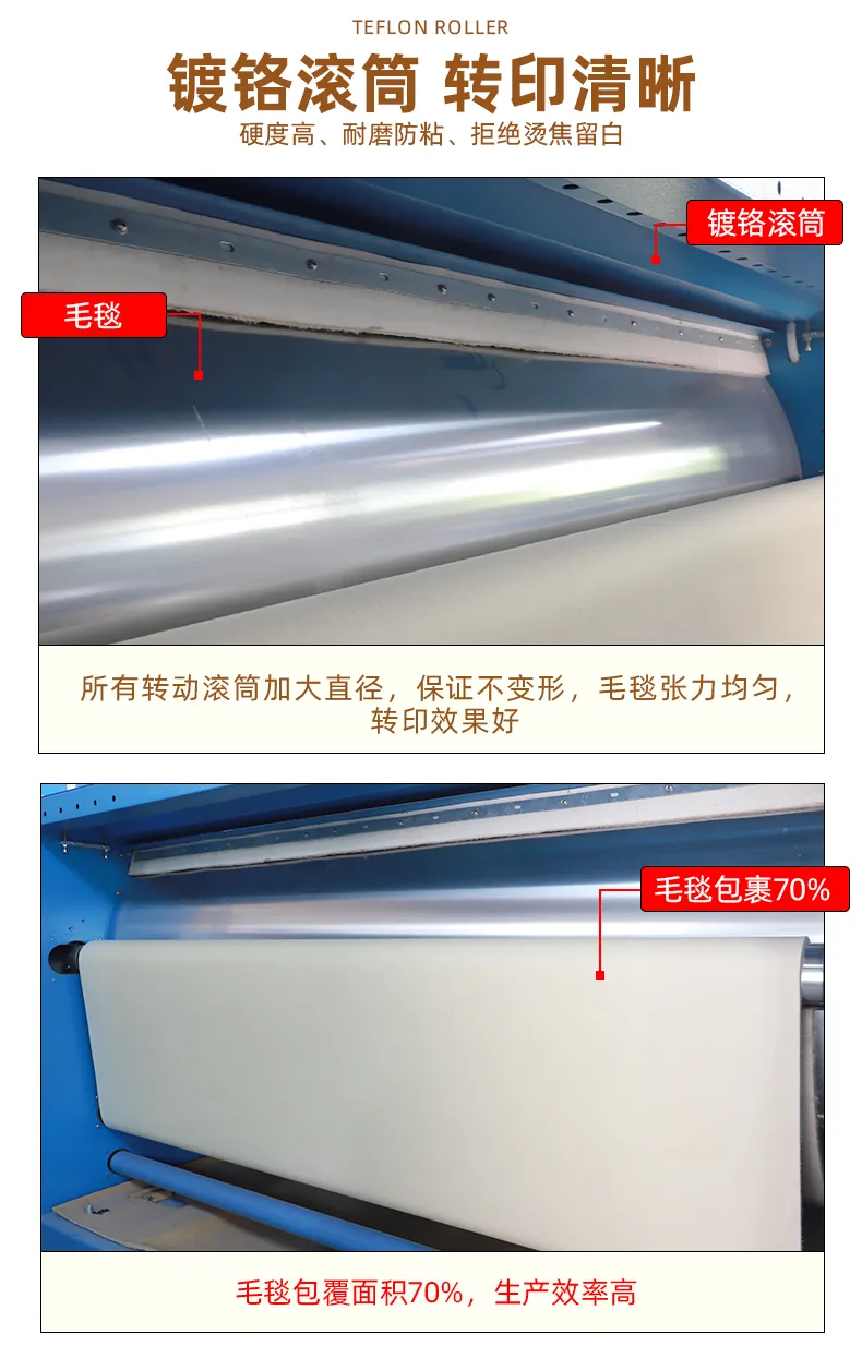 4、毛毯包裹滾筒面積達70%:溫區(qū)長(cháng),速↕₩ 度快(kuài),滾筒熱(rè)損耗小(xiǎo),£$₽≠相(xiàng)對(duì)标準版(毛毯50%包裹面積)省電(diàn)20 ±%;