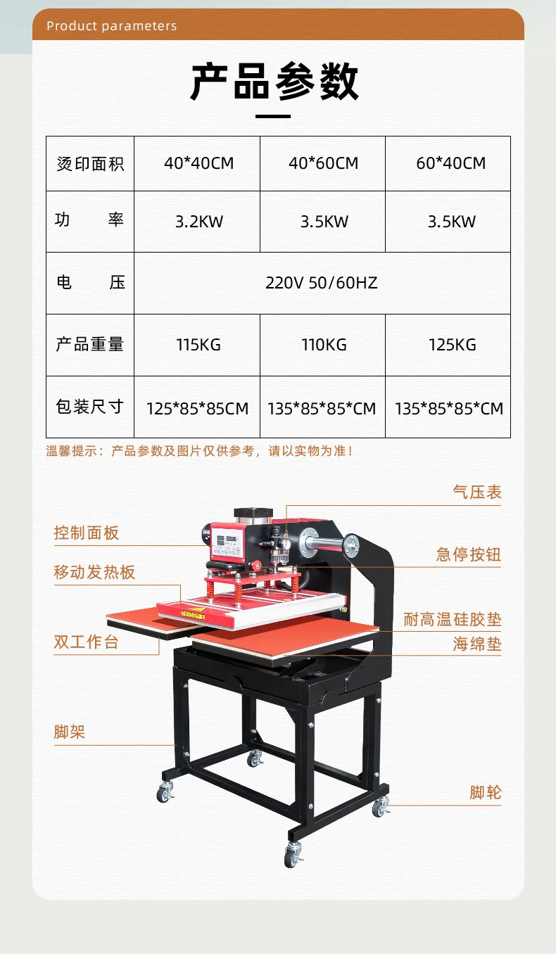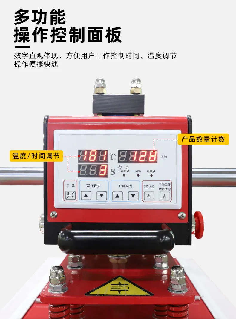 2、溫度、時(shí)間(jiān)數(shù)字直觀顯示,采用(y×σòng)氣壓燙畫(huà),壓力可(kě)達8♠•kg/cm²;