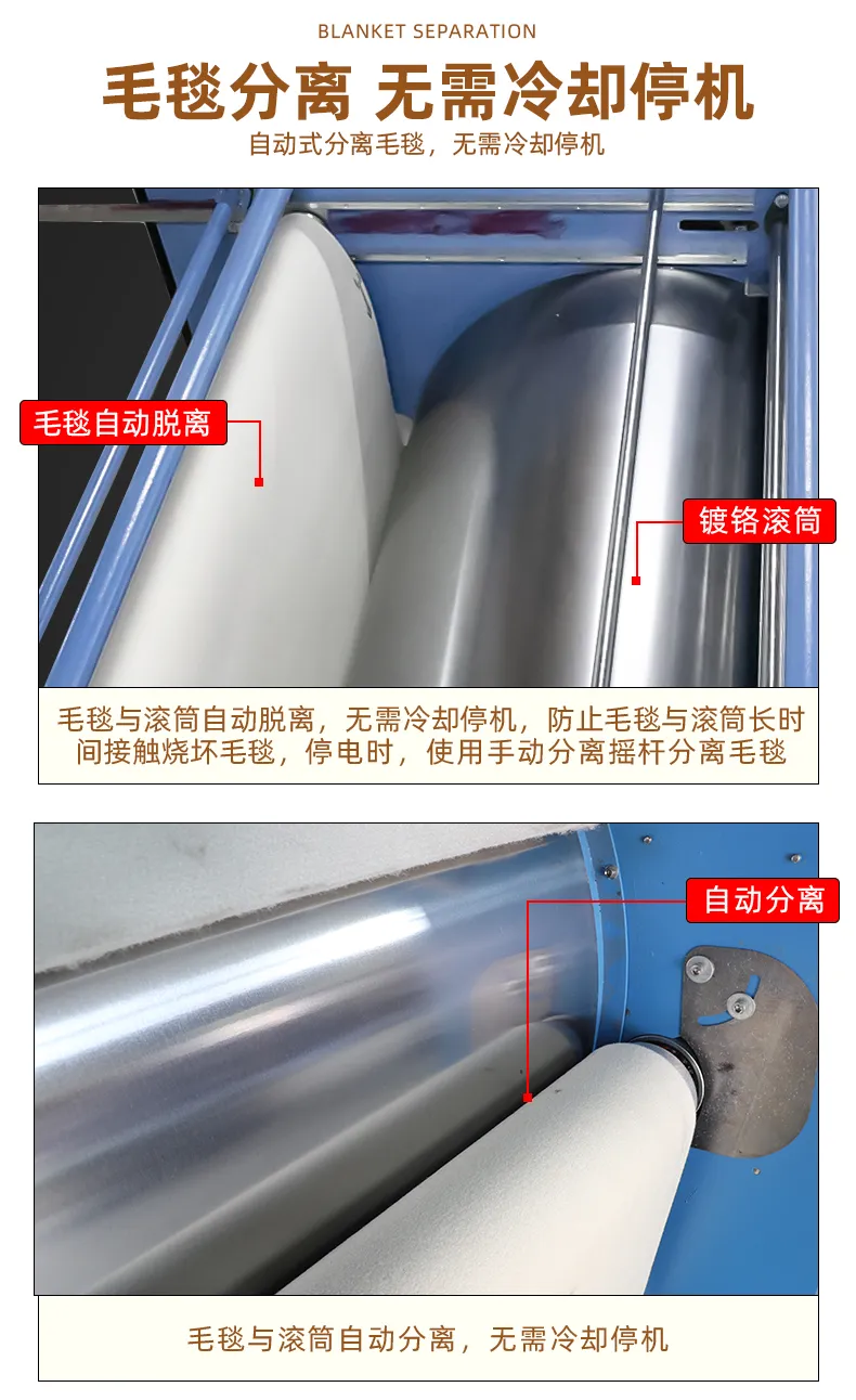 3、毛毯自(zì)動脫離(lí):無需冷(lěng)卻,ε'↕停機(jī)或者發生(shēng)故障既毛毯自(zì)動脫離(lí≠®),省人(rén)力(傳統停機(jī)後需要(yào)人(★¶&★rén)力搖動來(lái)分(fēn)離(lí")毛毯),有(yǒu)3~5cm安全距離(lí),防止毛毯燒傷;