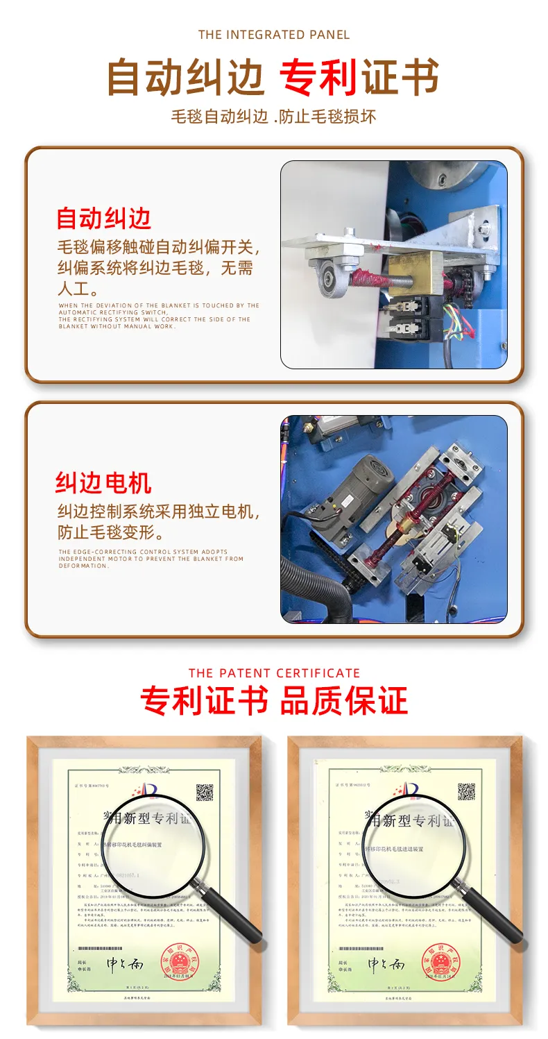 1、毛毯自(zì)動糾偏(我司專利技(jì)術(shù) ₩):智能(néng)防止毛毯跑偏、變形。損壞;
