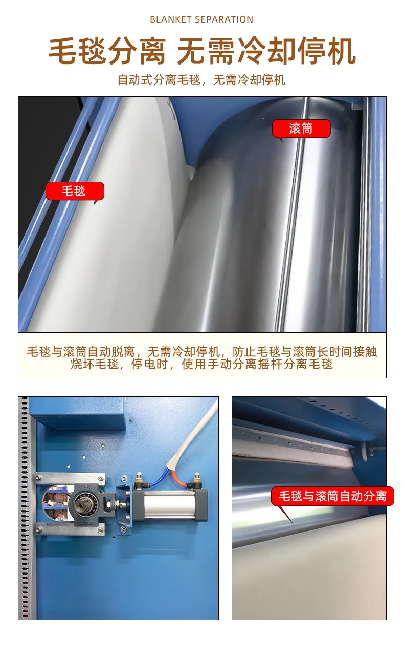 3、毛毯自(zì)動脫離(lí):無需冷(lěng)∑≥卻,停機(jī)或者發生(shēng)故障既•♣毛毯自(zì)動脫離(lí),省人(rén)力(傳統停♥'®±機(jī)後需要(yào)人(rén)力搖動來(lái)分(fēn)離(lí)φ&←¥毛毯),有(yǒu)3~5cm安全距離(lí),防止毛毯燒傷✘ ;