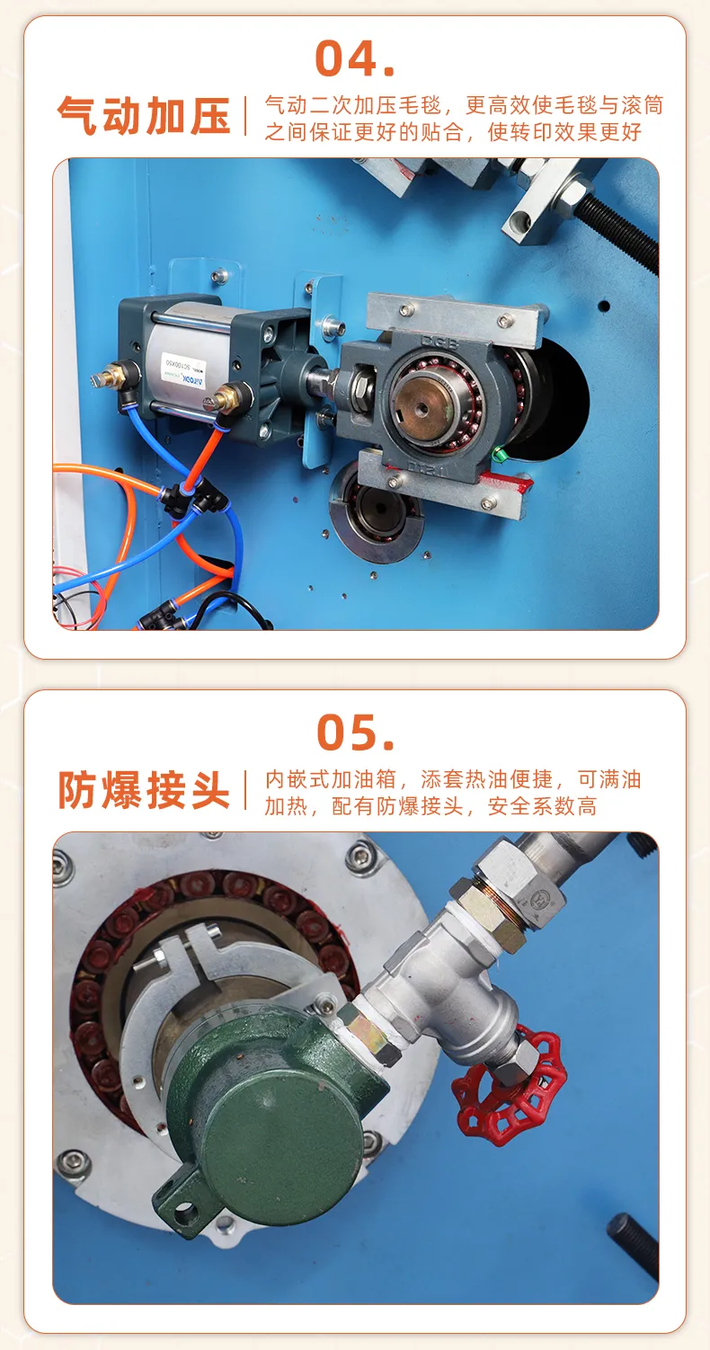 3、滾筒采用(yòng)鍍鋅技(jì)術(shù),硬度強、耐磨、φ±π防粘,轉印效果好(hǎo);