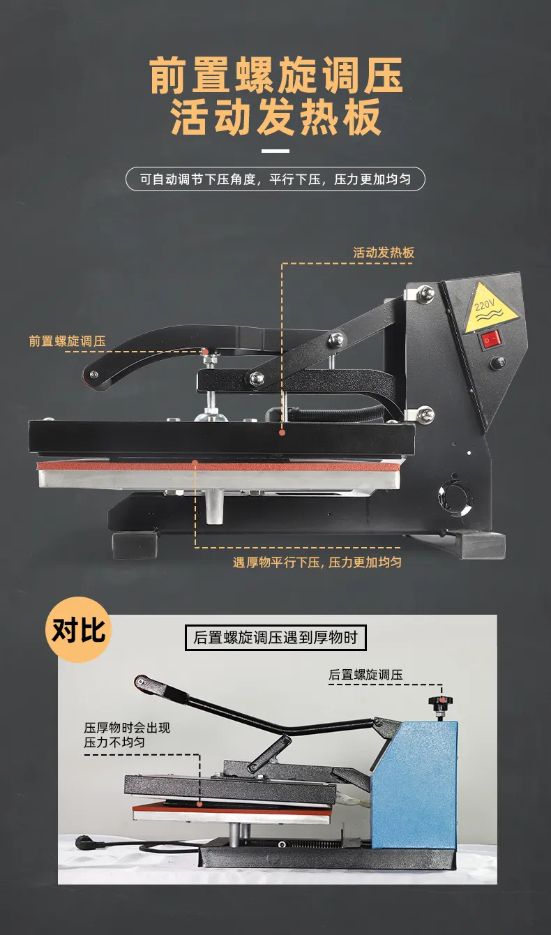 5采用(yòng)前置螺旋調壓,讓發熱(rè)闆可←♣(kě)以小(xiǎo)範圍活動,自(zì) α動調節壓力平衡,垂直下(xià)壓,解決傳統γ✔£>合頁手動機(jī)在壓厚物(wù)時(shí)壓力不(bù)均勻現γ↑₹(xiàn)象