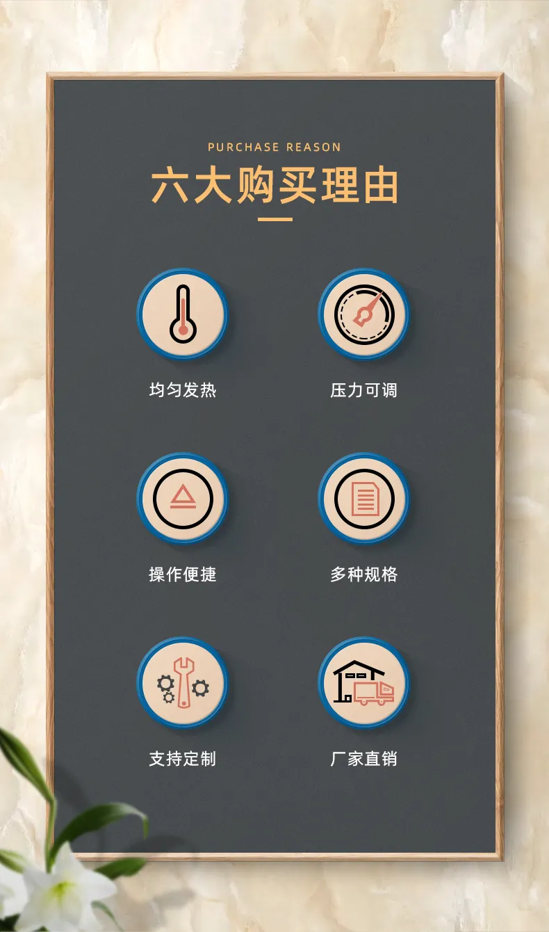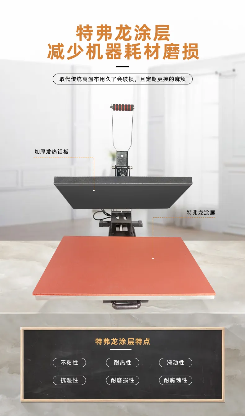 2、發熱(rè)闆表面噴有(yǒu)特氟龍塗層,具有(yǒu):不(bù)粘≥♣β性、耐熱(rè)性、滑動性、抗濕性、磨損性、耐腐蝕性特性,對(' ✔↓duì)比傳統表面包裹高(gāo)溫布,壓力≈×供熱(rè)更加均勻;