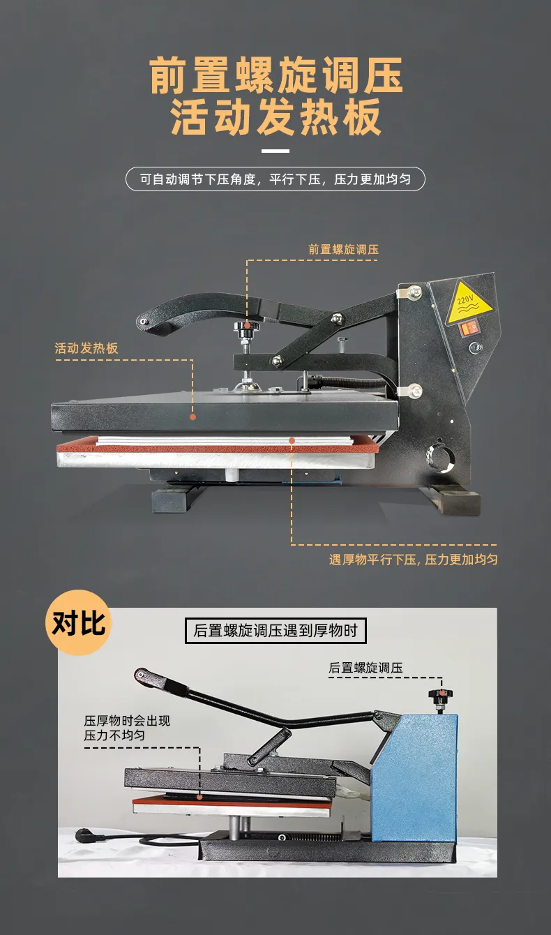5、采用(yòng)前置螺旋調壓,自(zì)動調節壓力平衡,垂≥ £直下(xià)壓,解決傳統合頁手動機(jī)在壓© γ厚物(wù)時(shí)壓力不(bù)均勻現(xi αàn)象