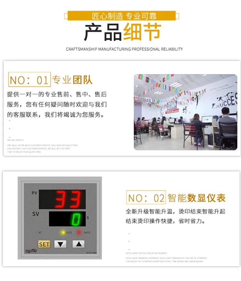 1、全新智能(néng)升溫,燙印結束智能(néng)升起,結束燙印₹€操作(zuò)便捷,省時(shí)省力;