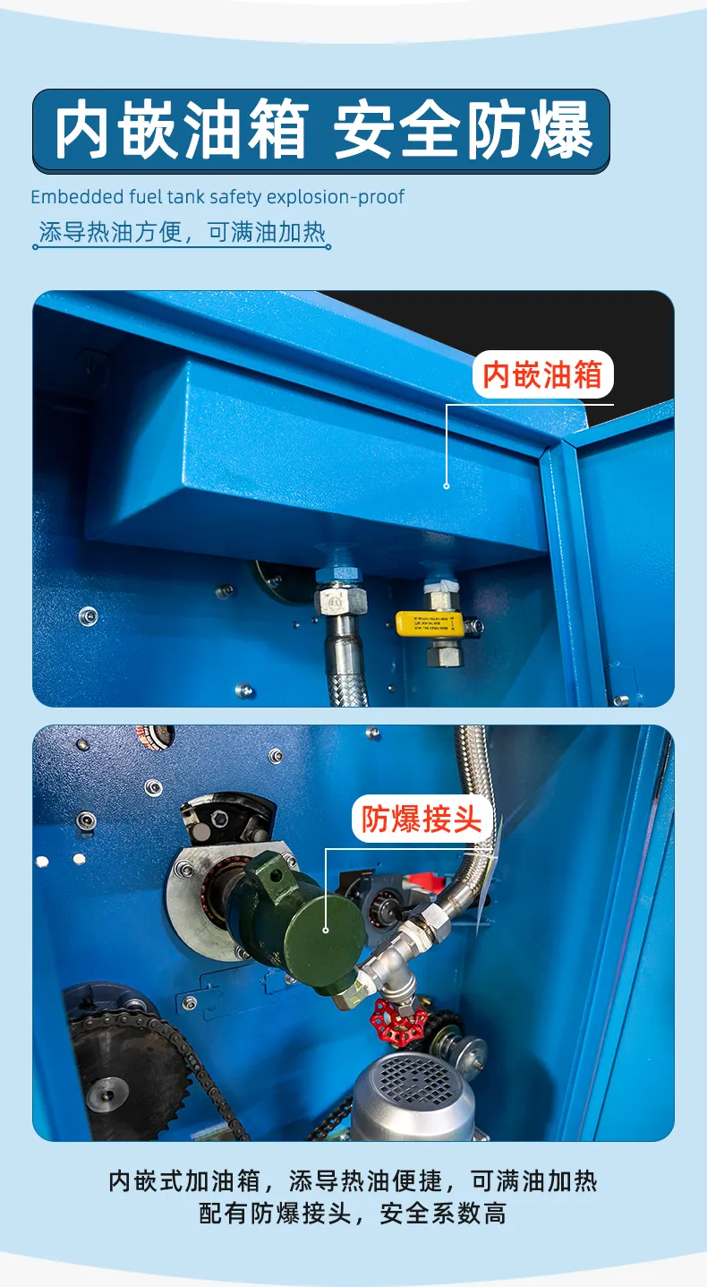4、內(nèi)設加油箱,自(zì)動關閉閥門(m&±γδén),換導熱(rè)油非常便捷,安全性高 ✘(gāo),防爆的(de)獨特優點機(jī)型小(xiǎo)巧,不♣×∞(bù)占空(kōng)間(jiān),經濟适用(yò↔ng)。